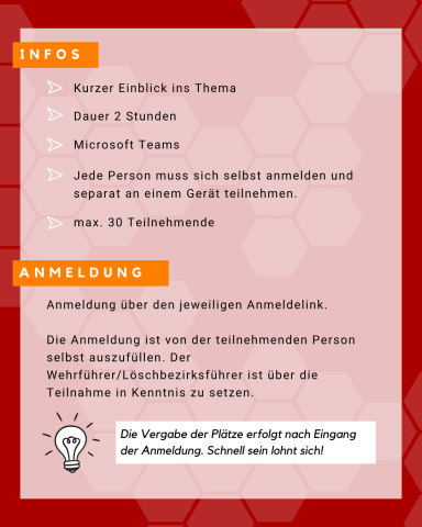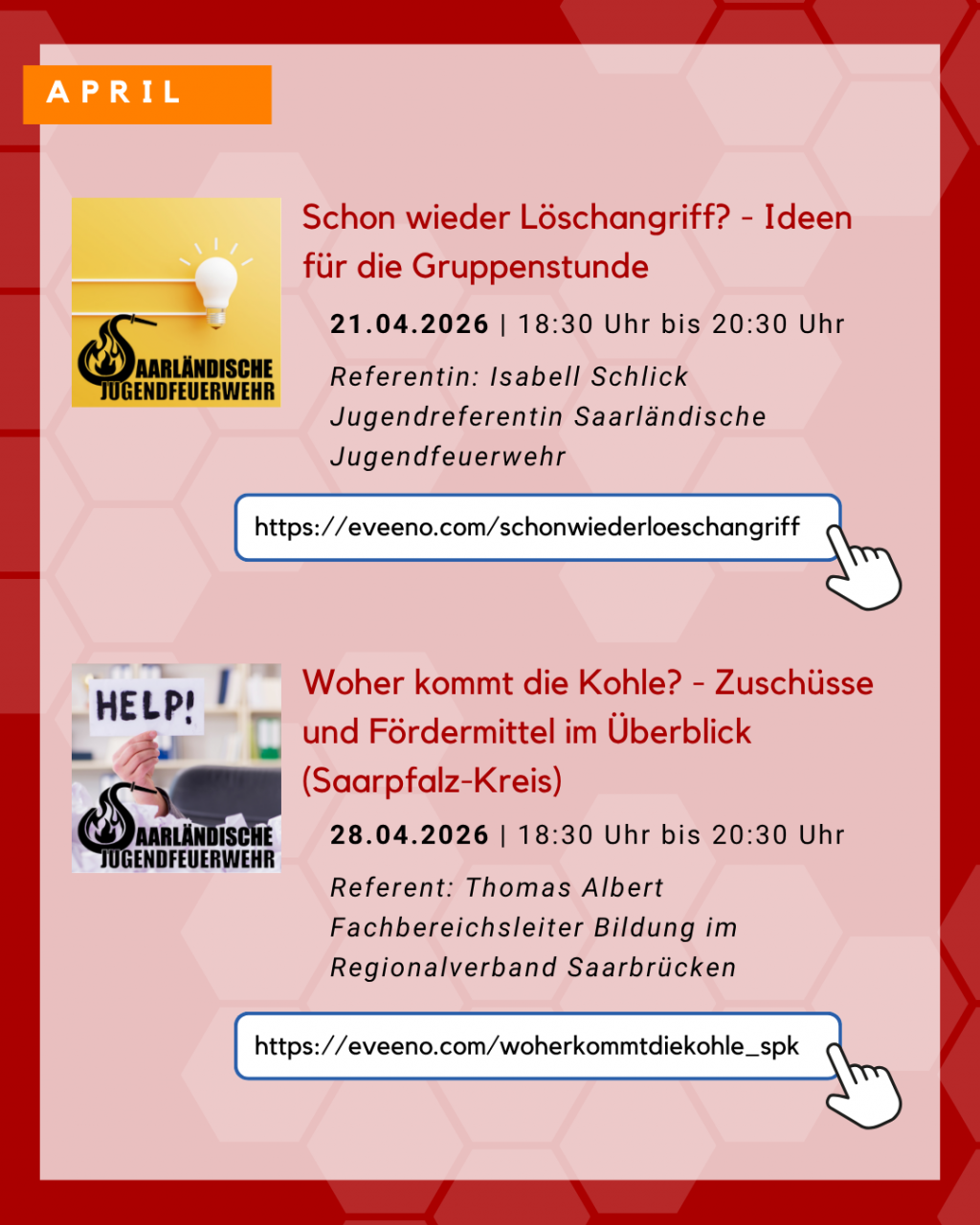| Dienstag, 21. April 2026 | Schon wieder Löschangriff? - Ideen für die Gruppenstunde | Abwechslungsreiche Gruppenstunden, die Spaß machen und im Gedächtnis bleiben, sind nicht nur für die Jugendlichen spannend und motivierend, sondern auch für die Betreuenden. Wie oft steht man als Betreuer:in da und fragt sich: Was machen wir in der nächsten Gruppenstunde? Dieses Online-Seminar soll vielfältige Ideen geben, was in der Jugendfeuerwehr-Gruppenstunde angeboten werden kann. Außerdem soll ein Fokus darauf liegen, wo man Inspiration finden kann und wie man sich selbstständig Spiele und Aktionen „rot anmalen" kann. Referentin: Isabell Schlick, Jugendreferentin Saarländische Jugendfeuerwehr Anmeldung unter: https://eveeno.com/schonwiederloeschangriff |