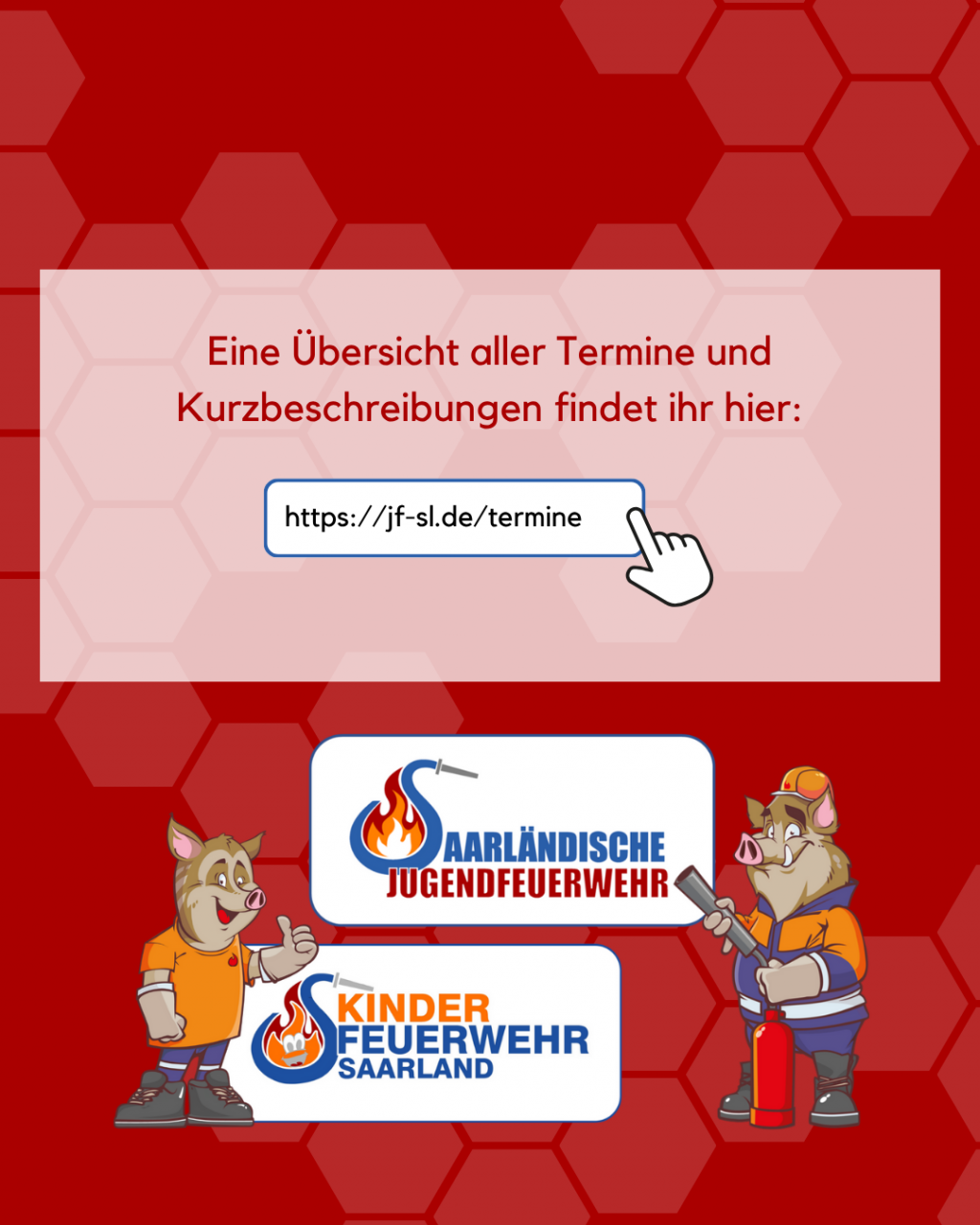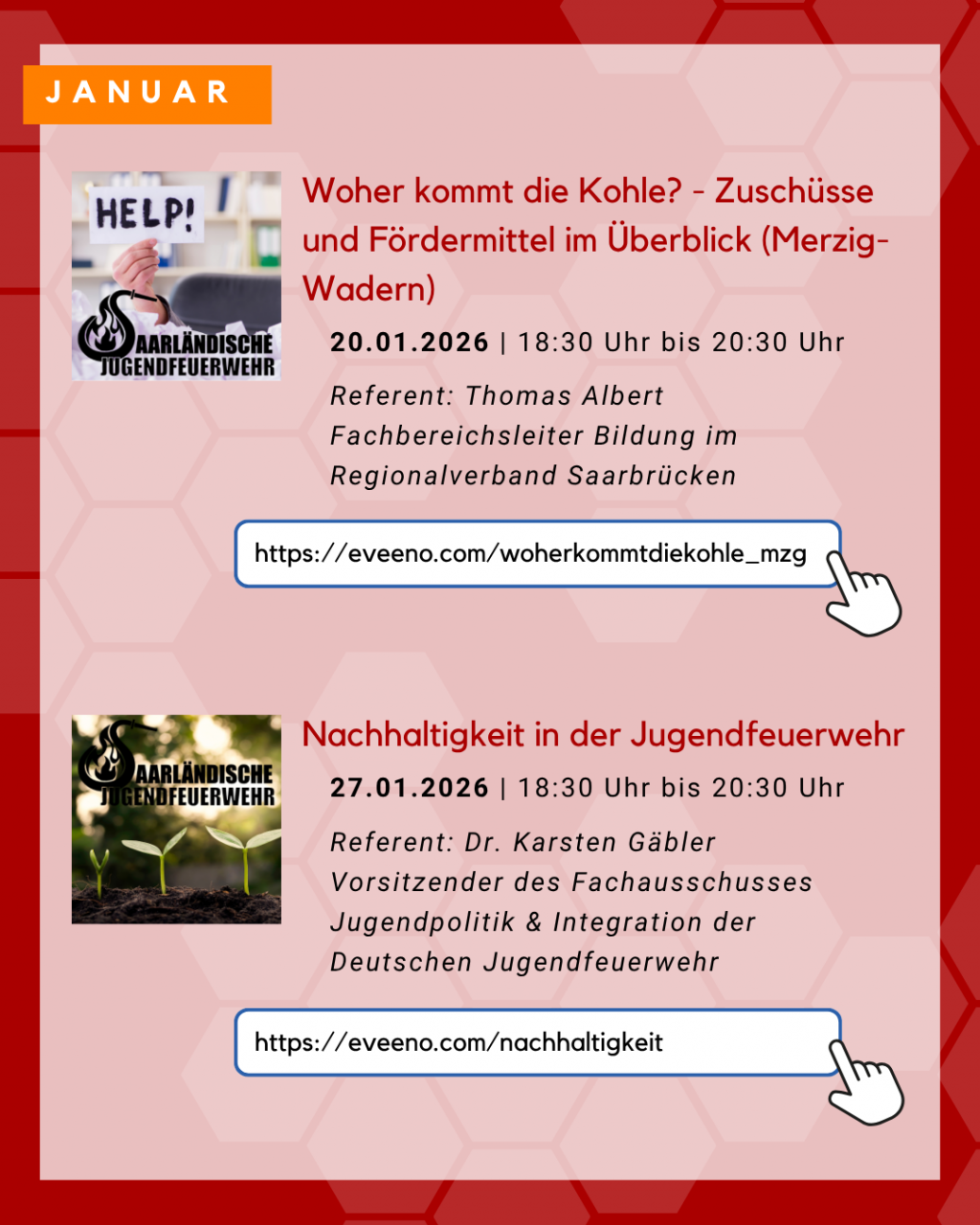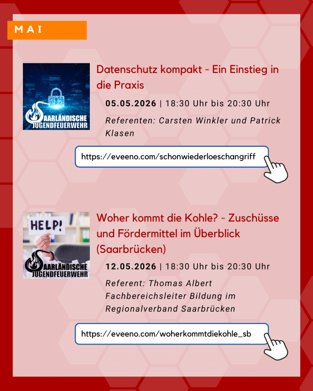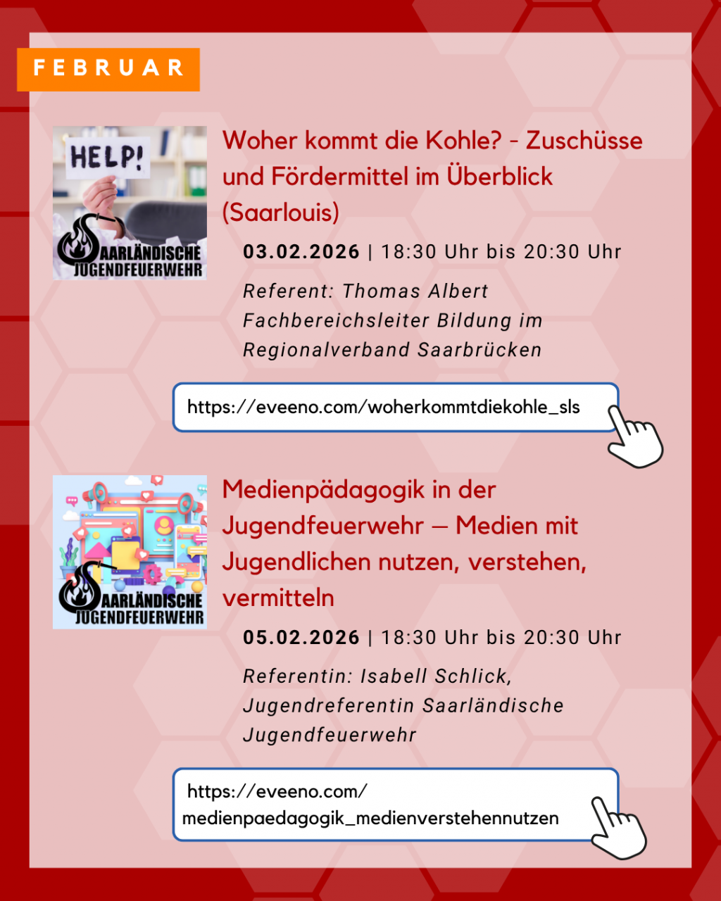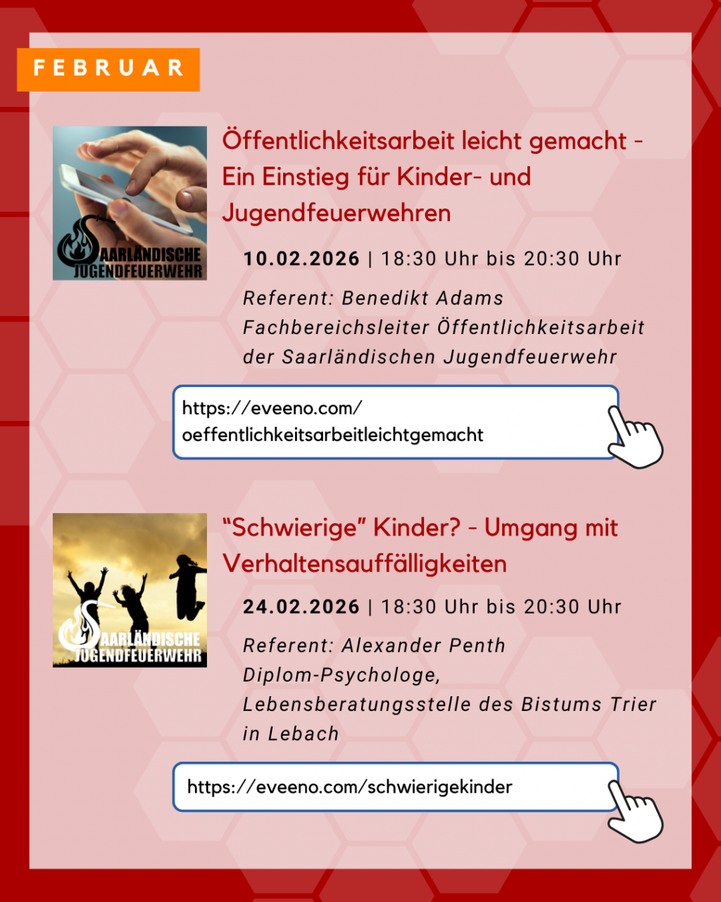 | Dienstag, 10. Februar 2026 | Öffentlichkeitsarbeit leicht gemacht - Ein Einstieg für Kinder- und Jugendfeuerwehren | In diesem 2-stündigen Online-Seminar erhalten Teilnehmende eine praxisorientierte Übersicht über die Grundlagen der Öffentlichkeitsarbeit in der Kinder- und Jugendfeuerwehr. Neben der Bedeutung einer gezielten Kommunikation werden einfache Maßnahmen, geeignete Kanäle und Tipps für die Umsetzung vorgestellt. Ziel ist es, Verantwortlichen und Betreuenden Impulse zu geben, wie sie ihre Arbeit sichtbar machen und junge Menschen sowie deren Eltern erfolgreich ansprechen können. Referent: Benedikt Adams, Fachbereichsleiter Öffentlichkeitsarbeit der Saarländischen Jugendfeuerwehr Anmeldung unter: https://eveeno.com/oeffentlichkeitsarbeitleichtgemacht |