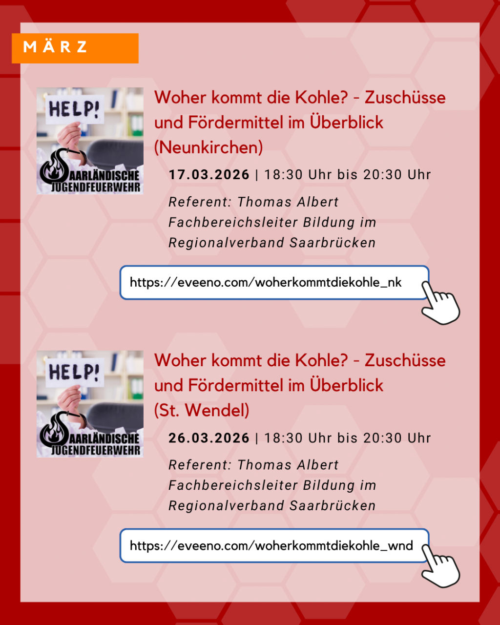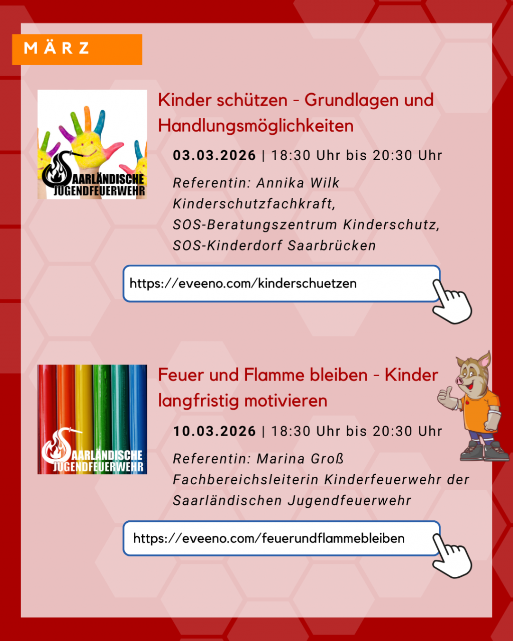 Dienstag, 10. März 2026 | Feuer und Flamme bleiben - Kinder langfristig motivieren | Wie gelingt es Kinder langfristig für die Feuerwehr zu begeistern? Dieses Online-Seminar zeigt auf, wie Motivation entsteht und was Kinder interessiert. Außerdem sollen Ideen gegeben werden, wie Gruppenstunden abwechslungsreich, spannend und kindgerecht gestaltet werden können. Dieses Online-Seminar richtet sich speziell an Betreuerinnen und Betreuer der Kinderfeuerwehren. Referentin: Marina Groß, Fachbereichsleiterin Kinderfeuerwehr der Saarländischen Jugendfeuerwehr Anmeldung unter: https://eveeno.com/feuerundflammebleiben |