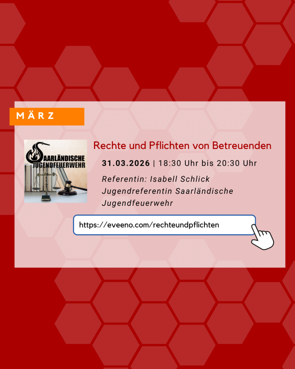 | Dienstag, 31. März 2026 | Rechte und Pflichten von Betreuenden | Jugendleiterinnen und Jugendleiter haben im Umgang mit Kindern und Jugendlichen Rechte und Pflichten. Sie beaufsichtigen Kinder, bilden sie weiter, fordern sie und sind deren Ansprechpartner:innen und Vertraute. Dabei sind einige (rechtliche) Grundlagen zu beachten, es bestehen Pflichten, z.B. die Aufsichtspflicht oder die Sicherstellung des Kindeswohls. Auf der anderen Seite haben Jugendleiter:innen auch Rechte: Sie dürfen sich selbst schützen und dürfen auch entscheiden, was ihre eigenen Fähigkeiten zulassen. Dieses Online-Seminar gibt einen knappen Überblick über die wichtigsten Rechte und Pflichten von Betreuenden. Referentin: Isabell Schlick, Jugendreferentin Saarländische Jugendfeuerwehr Anmeldung unter: https://eveeno.com/rechteundpflichten |